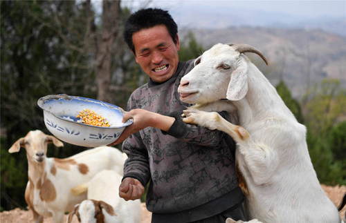 2019年3月27日,在河南省盧氏縣沙河鄉(xiāng)果角村,村民任當(dāng)鋒在喂羊。41歲的任當(dāng)鋒曾多年在外打工,由于腰部有傷不能干重活。2018年,在知悉盧氏縣的金融扶貧政策后,任當(dāng)鋒返鄉(xiāng)創(chuàng)業(yè),用貸來的5萬元無擔(dān)保無抵押小額貸款,購買了38只羊,從打工仔變成了一個(gè)羊倌。 新華社記者李嘉南攝