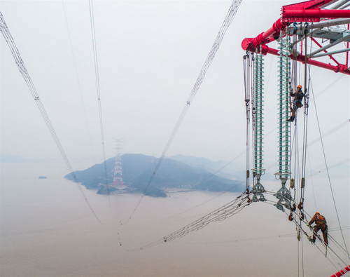 2019年1月3日,施工人員在浙江省舟山500千伏聯(lián)網(wǎng)輸變電工程380米跨海輸電鐵塔上進(jìn)行驗(yàn)收和消缺作業(yè)(無人機(jī)照片)。新華社記者徐昱攝