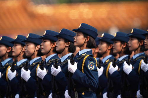 2019年10月1日,慶祝中華人民共和國成立70周年大會(huì)在北京天安門廣場隆重舉行。這是女兵方隊(duì)接受檢閱。新華社記者王毓國攝