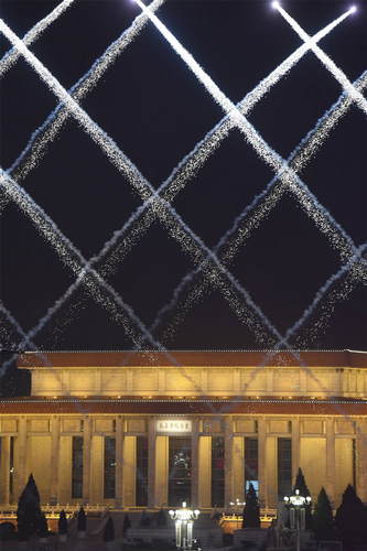 2019年10月1日,慶祝中華人民共和國成立70周年大會(huì)在北京天安門廣場隆重舉行。這是空中梯隊(duì)飛過天安門上空。新華社記者金良快攝