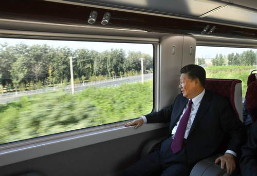 2019年9月25日上午,北京大興國際機(jī)場投運(yùn)儀式在北京舉行。中共中央總書記、國家主席、中央軍委主席習(xí)近平出席儀式,宣布機(jī)場正式投運(yùn)并巡覽航站樓。這是習(xí)近平乘坐軌道列車前往北京大興國際機(jī)場。新華社記者謝環(huán)馳攝