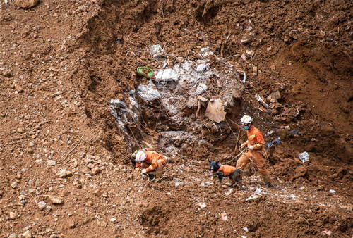 2019年7月26日,救援人員在貴州省水城縣“7·23”特大山體滑坡災(zāi)害現(xiàn)場進(jìn)行搜救。新華社記者陶亮攝