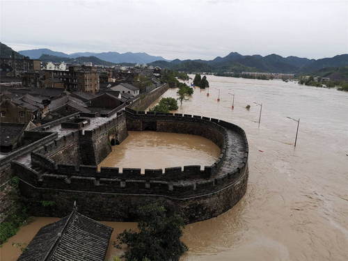 2019年8月,超強(qiáng)臺風(fēng)“利奇馬”引發(fā)的洪水圍困浙江省臨海市。這是8月10日拍攝的被洪水圍困的臨海古城(無人機(jī)照片)。新華社發(fā)