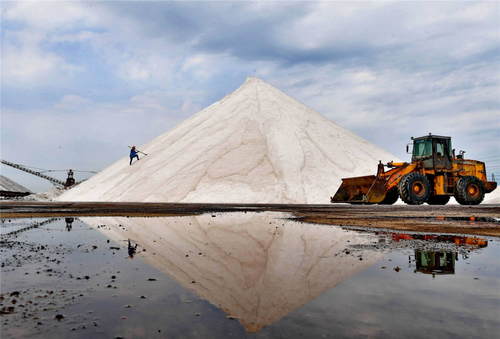 2019年7月3日,河北唐山海港經(jīng)濟(jì)開發(fā)區(qū)大清河鹽場的工人在洗鹽場工作。新華社記者楊世堯攝