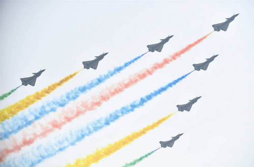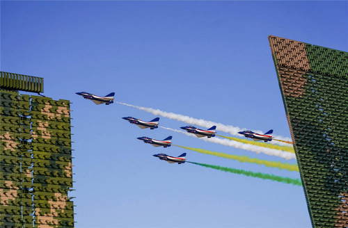 2019年10月21日,在吉林長春舉行的慶祝人民空軍成立70周年航空開放活動(dòng)上,空軍八一飛行表演隊(duì)殲-10飛機(jī)編隊(duì)從靜態(tài)展示的新型雷達(dá)上空飛過。新華社發(fā)(萬全攝)
