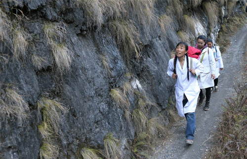2019年1月13日,在云南省貢山縣丙中洛鎮(zhèn),管延萍(左)與同事走在進(jìn)村的山路上。管延萍從經(jīng)濟(jì)發(fā)達(dá)的珠三角地區(qū),自愿到深度貧困地區(qū)云南怒江傈僳族自治州參加?xùn)|西部扶貧協(xié)作,并主動(dòng)申請將期限從半年延長至3年。 新華社記者張加揚(yáng)攝