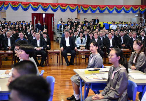 2019年12月19日,國家主席習(xí)近平在澳門特別行政區(qū)行政長官崔世安陪同下,來到位于澳門黑沙環(huán)的政府綜合服務(wù)中心和濠江中學(xué)附屬英才學(xué)校,同澳門市民和師生親切交流。這是習(xí)近平在濠江中學(xué)附屬英才學(xué)校觀摩以“‘一國兩制’與澳門”為題的中國歷史公開課。新華社記者李濤攝