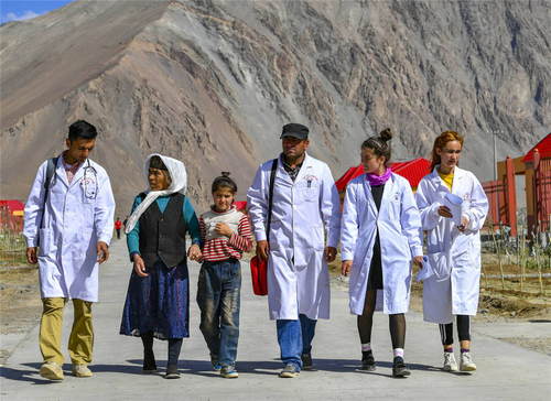 2019年7月7日,新疆塔什庫爾干塔吉克自治縣達(dá)布達(dá)爾鄉(xiāng)熱斯喀木村村醫(yī)發(fā)爾亞特·塔西白克(右三)與來自鄉(xiāng)衛(wèi)生院的醫(yī)務(wù)人員來到熱斯喀木村易地扶貧搬遷安置點(diǎn)出診。從過去騎著馬深入大山牧場巡診,到現(xiàn)在定期前往集中居住點(diǎn)上門服務(wù);從過去幾種簡單的常備藥,到如今種類豐富的各類藥品……新疆牧區(qū)的醫(yī)療條件和水平大幅提升,牧民享受到越來越多、越來越便利的醫(yī)療惠民服務(wù)。新華社記者胡虎虎攝