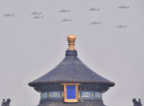2019年10月1日,慶祝中華人民共和國成立70周年大會(huì)在北京天安門廣場隆重舉行。這是從天壇公園拍攝的陸航突擊梯隊(duì)。新華社記者賀長山攝