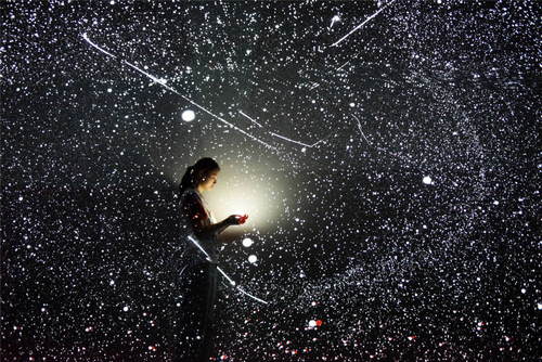 2019年5月28日, 參觀者在貴州省貴陽市舉辦的2019中國國際大數(shù)據(jù)產(chǎn)業(yè)博覽會(huì)“追夢·未來”數(shù)字藝術(shù)特展上觀看和體驗(yàn)藝術(shù)作品《宇宙深空》。新華社記者楊文斌攝