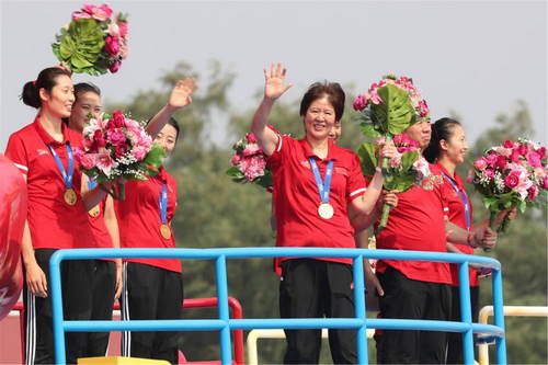 2019年10月1日,慶祝中華人民共和國成立70周年大會(huì)在北京天安門廣場隆重舉行。這是中國女排亮相“祖國萬歲”彩車。新華社記者歐東衢攝