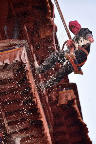 2019年11月1日,在西藏拉薩市布達(dá)拉宮,施工人員給墻體噴灑涂料。當(dāng)日,布達(dá)拉宮每年一度的墻體粉刷工程正式啟動(dòng),這也是布達(dá)拉宮例行的“年度美容”。新華社記者覺(jué)果攝