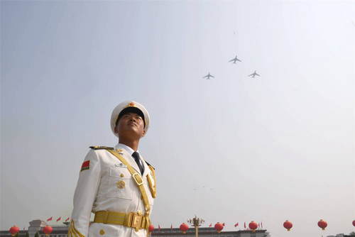 2019年10月1日,慶祝中華人民共和國成立70周年大會在北京天安門廣場隆重舉行。這是空中梯隊飛過天安門上空。新華社記者金良快攝