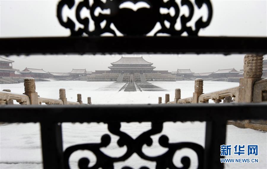 12月16日拍攝的雪中的故宮太和殿廣場(chǎng)。當(dāng)日,北京迎來降雪天氣。新華社記者金良快攝