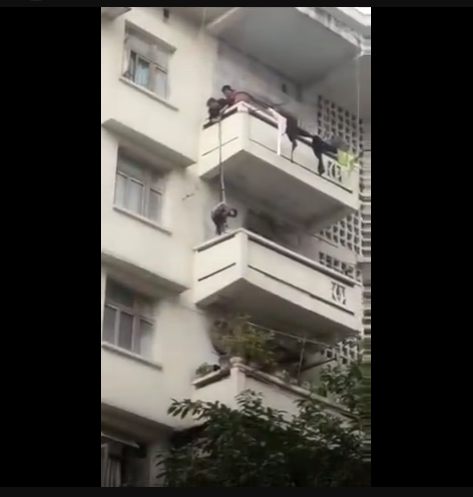 一只貓跑到了百順街老百貨公司宿舍樓三樓的窗戶遮雨臺上,被5樓的老太太發(fā)現(xiàn),老太太善心發(fā)作,竟將孫子用繩子吊起,從5樓慢慢放至3樓救貓,整個(gè)過程不禁令人捏汗。