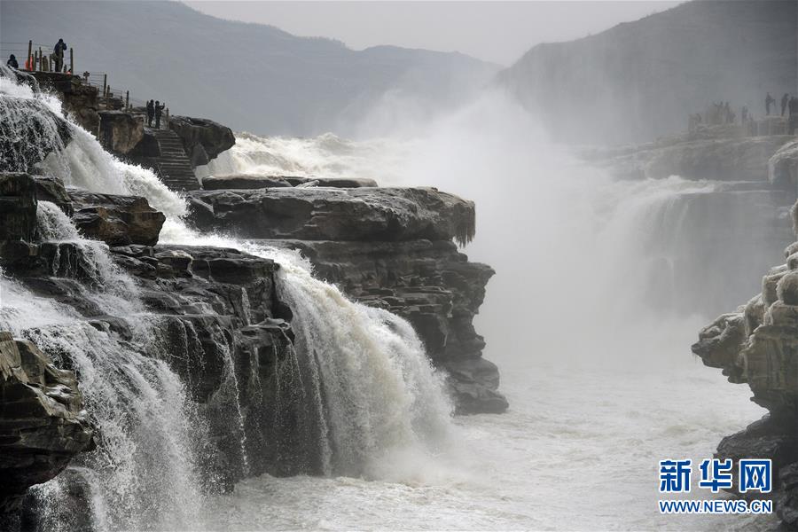 受近日降雨影響,位于山西吉縣的壺口瀑布水量增大,壯美的瀑布群景觀吸引眾多游客前來觀賞。新華社記者楊晨光攝