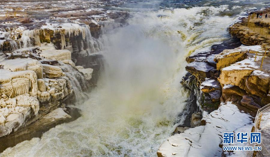 12月14日,游人在壺口瀑布景區(qū)游玩(無人機拍攝)。位于秦晉大峽谷的黃河壺口瀑布,冬日水量較夏日雖然有所減少,但驚天動地的濤聲依舊,周圍石壁上的冰掛與河中的浪濤構成一幅獨特的北國風光圖,吸引游客前來觀賞。新華社記者陶明攝