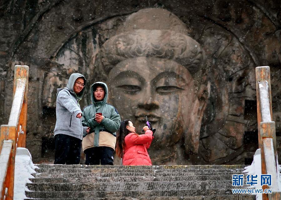 1月9日,游客在雪中游覽洛陽(yáng)龍門石窟景區(qū)。新華社記者李安攝