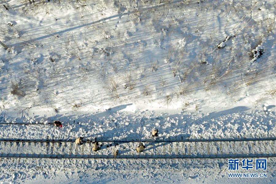 1月8日,西羅奇維修工隊(duì)工作人員在嫩林線501公里處進(jìn)行線路維修作業(yè)(無人機(jī)照片)。新華社記者王毓國攝