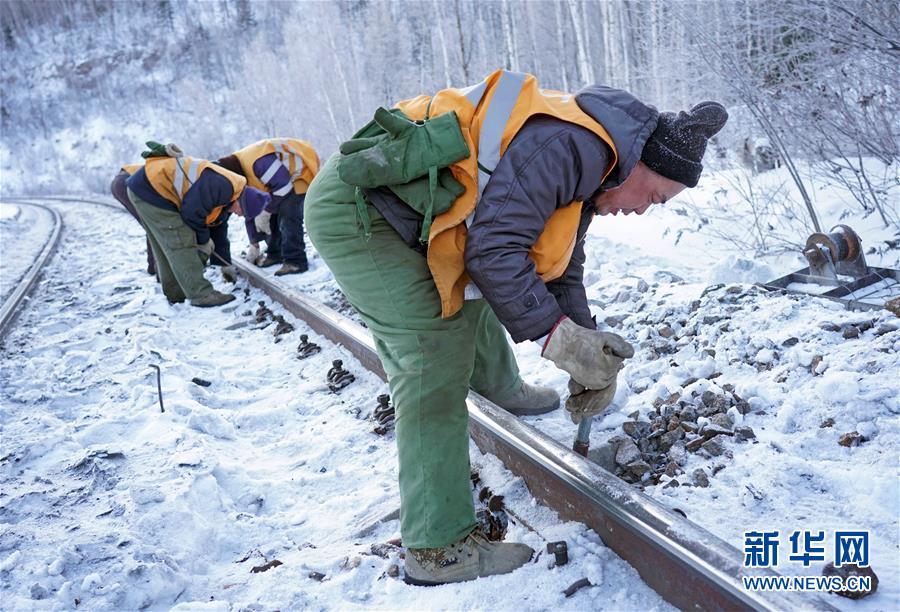 1月7日,西羅奇維修工隊(duì)工作人員在加格達(dá)奇工務(wù)段西羅奇嶺二號隧道附近進(jìn)行維修作業(yè)。新華社記者才揚(yáng)攝