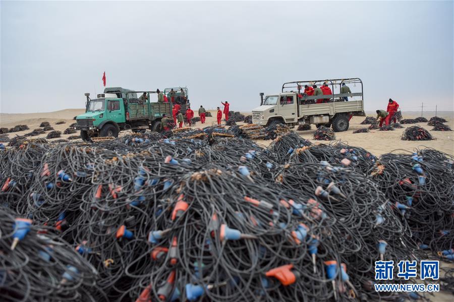 1月14日,放線工在出工前將一捆捆檢波器裝車。地球物理勘探是油氣開(kāi)發(fā)的第一步,相當(dāng)于給地球做CT。物探工人按照嚴(yán)格的測(cè)線部署,在相應(yīng)位置鉆井,然后實(shí)施地震,采集地震波數(shù)據(jù)。科研人員通過(guò)數(shù)據(jù)組成的“CT片”,就能夠清晰地“看”到地下的地質(zhì)結(jié)構(gòu),判斷哪里埋藏有石油或者天然氣。2019年10月,東方地球物理勘探有限責(zé)任公司塔里木物探處2113隊(duì)進(jìn)入新疆塔克拉瑪干沙漠腹地,開(kāi)始中古14-21、塔中2兩個(gè)區(qū)塊的三維地震勘探。近2000名物探工人將在1000平方公里的范圍內(nèi)一直工作到2020年4月,這也意味著他們將在塔克拉瑪干沙漠腹地連續(xù)度過(guò)第14個(gè)除夕夜。蘊(yùn)藏著豐富石油天然氣資源的新疆塔克拉瑪干沙漠有“死亡之?!敝Q,氣候干燥,年降水量在50毫米以下,冬季地表最低溫度超過(guò)零下30攝氏度,是世界油氣勘探難度最大的地區(qū)之一。為避開(kāi)風(fēng)季,物探工人每年9、10月份進(jìn)入沙漠,一直工作到來(lái)年4月,夜以繼日與黃沙、嚴(yán)寒為伴,用辛勤的汗水,為祖國(guó)找油找氣。新華社記者丁磊攝
