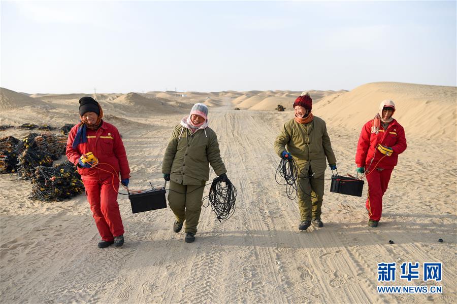 1月14日,4名測線女工抬著電瓶返回營地。地球物理勘探是油氣開發(fā)的第一步,相當于給地球做CT。物探工人按照嚴格的測線部署,在相應(yīng)位置鉆井,然后實施地震,采集地震波數(shù)據(jù)??蒲腥藛T通過數(shù)據(jù)組成的“CT片”,就能夠清晰地“看”到地下的地質(zhì)結(jié)構(gòu),判斷哪里埋藏有石油或者天然氣。2019年10月,東方地球物理勘探有限責任公司塔里木物探處2113隊進入新疆塔克拉瑪干沙漠腹地,開始中古14-21、塔中2兩個區(qū)塊的三維地震勘探。近2000名物探工人將在1000平方公里的范圍內(nèi)一直工作到2020年4月,這也意味著他們將在塔克拉瑪干沙漠腹地連續(xù)度過第14個除夕夜。蘊藏著豐富石油天然氣資源的新疆塔克拉瑪干沙漠有“死亡之海”之稱,氣候干燥,年降水量在50毫米以下,冬季地表最低溫度超過零下30攝氏度,是世界油氣勘探難度最大的地區(qū)之一。為避開風季,物探工人每年9、10月份進入沙漠,一直工作到來年4月,夜以繼日與黃沙、嚴寒為伴,用辛勤的汗水,為祖國找油找氣。新華社記者丁磊攝