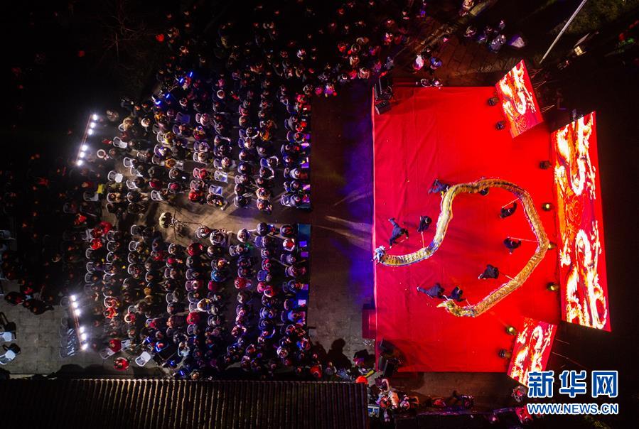 1月14日,杭州市余杭區(qū)中泰街道中橋村的文化公園內在進行“我們的村晚”舞龍表演,吸引了大批當?shù)匕傩沼^看(無人機照片)。臨近春節(jié),浙江省杭州市余杭區(qū)中泰街道各村社的文化禮堂紛紛上演“我們的村晚”。老百姓自編、自導、自演為主的“土味”聯(lián)歡會因接地氣、親情濃而深受當?shù)匕傩盏南矏?,成為當?shù)剜l(xiāng)村百姓的新年迎春“文化大餐”。近年來,中泰街道以文化振興助推鄉(xiāng)村振興。目前,中泰街道下屬各村陸續(xù)建成文化禮堂7個、社區(qū)文化家園2個,努力培育和挖掘出一批鄉(xiāng)土文化人才及原創(chuàng)作品,2019年全年開展各類鄉(xiāng)村社區(qū)惠民文體活動累計180余場次。新華社記者徐昱攝