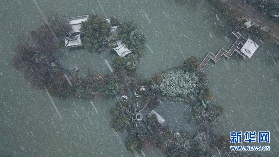這是1月15日拍攝的合肥市包公園雪景(無人機照片)。 當日,安徽省合肥市迎來降雪天氣。雪中的合肥市包公園景色別致。 新華社記者 張端 攝