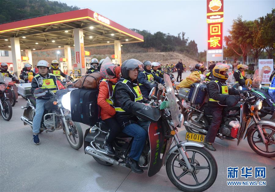 1月15日,在福建泉州,騎摩托車(chē)返鄉(xiāng)的外來(lái)務(wù)工人員啟程返鄉(xiāng)。 新華社記者 賀燦鈴 攝