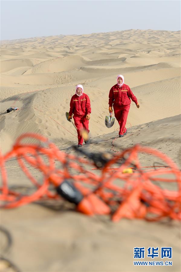 放線(xiàn)工張進(jìn)秀(右)和陳莉云翻越沙丘進(jìn)行放線(xiàn)工作(1月14日攝)。新華社記者 丁磊 攝