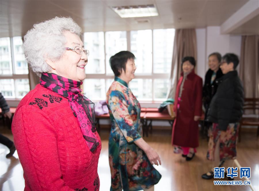 1月17日,王育華(前)向杭州市社會福利中心模特隊的一名隊員學(xué)習(xí)走臺步。新華社記者 翁忻旸 攝