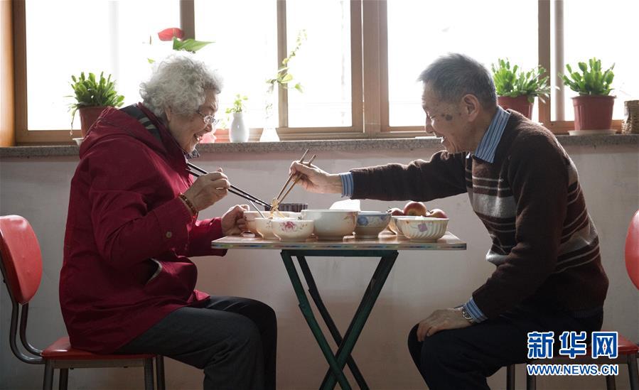 1月17日,王育華(左)和丈夫李偉光在杭州市社會(huì)福利中心宿舍吃午飯。新華社記者 翁忻旸 攝