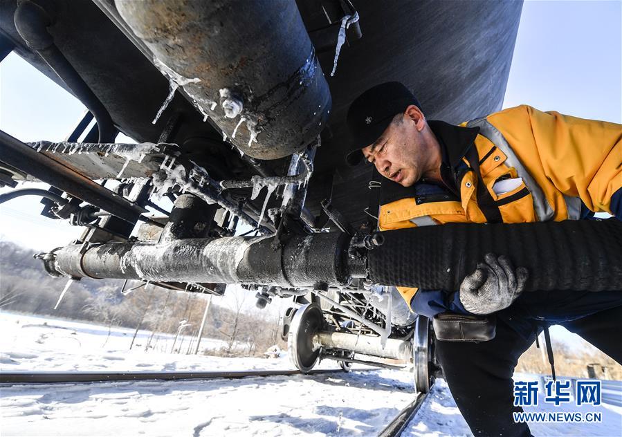 林海間的“送水小火車”調(diào)車員對“送水小火車”進(jìn)行出行前的檢查作業(yè)(1月17日攝)。新華社記者許暢攝