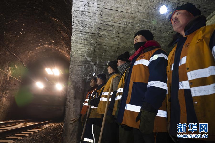 1月7日,在加格達(dá)奇工務(wù)段西羅奇嶺二號隧道,西羅奇維修工隊(duì)工作人員在避車洞內(nèi)躲避列車。新華社記者才揚(yáng)攝