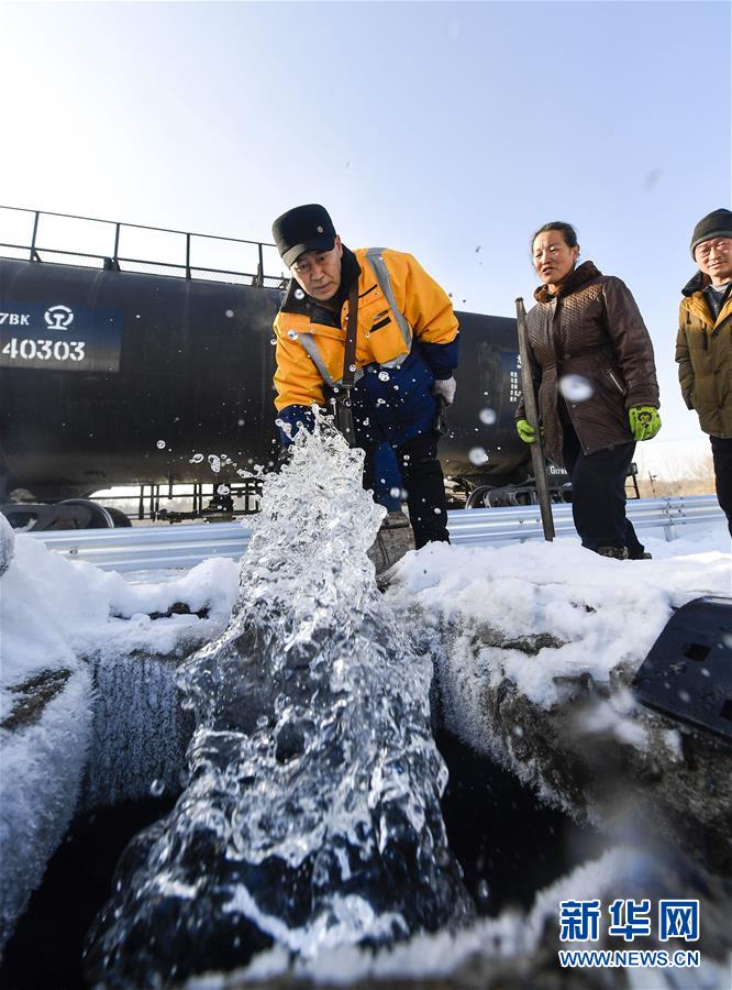 因?yàn)槎緶囟冗^低,送水員黃衛(wèi)東在蓄水前需要提前加熱閥門(1月17日攝)。新華社記者許暢攝