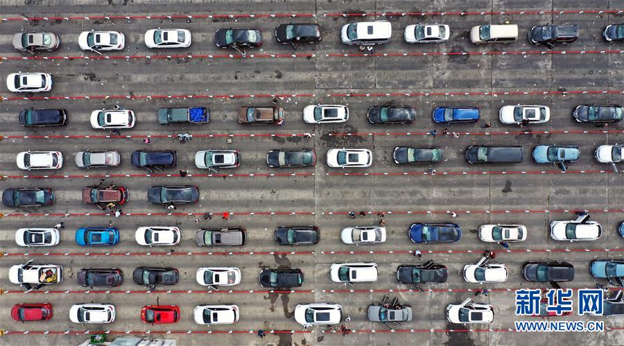 1月19日,車輛在??谛阌⒏圯喍纱a頭等待登船(無人機照片)。 新華社記者 郭程 攝