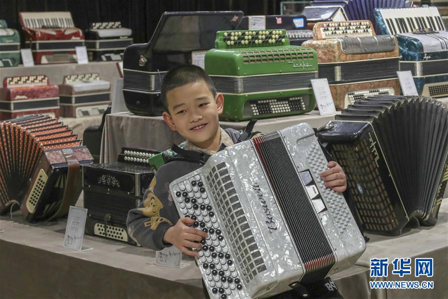 在塔城市手風琴博物館,當地一名小朋友為游客演奏手風琴(1月21日攝)。新華社記者 趙戈 攝