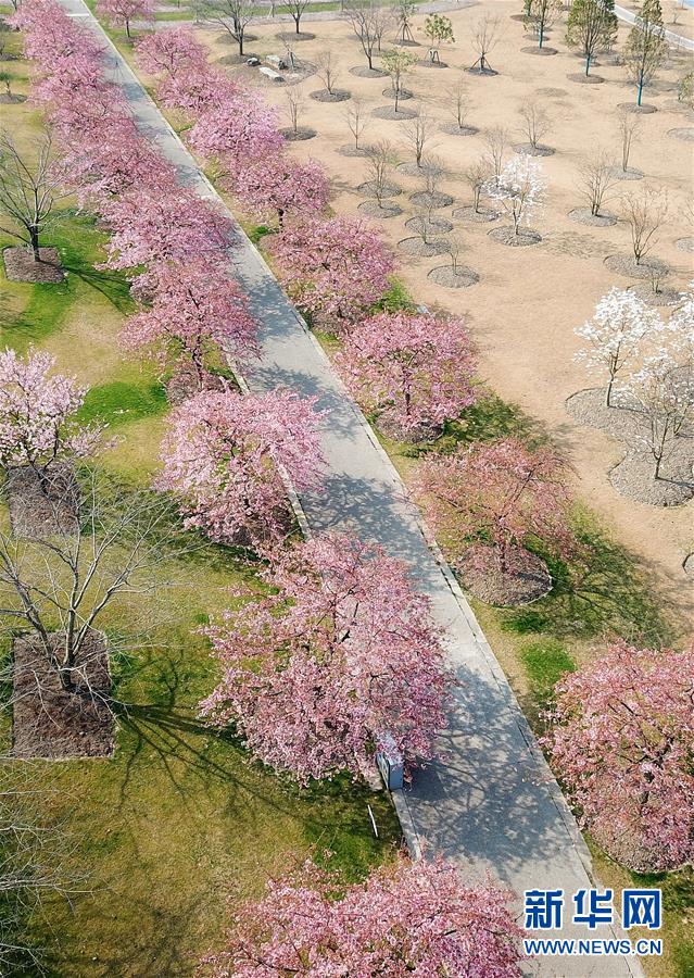 這是2月24日在上海松江辰山植物園內(nèi)拍攝的櫻花小徑(無人機照片)。 新華社記者 方喆 攝