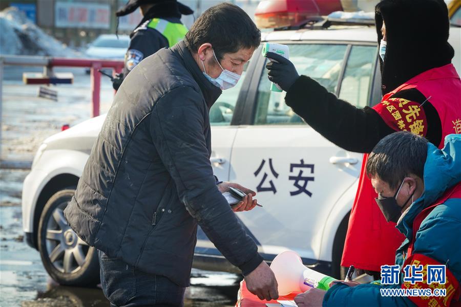 2月24日,工作人員在哈同高速公路哈爾濱收費(fèi)站為車輛人員登記、測(cè)體溫。  新華社記者 王松 攝
