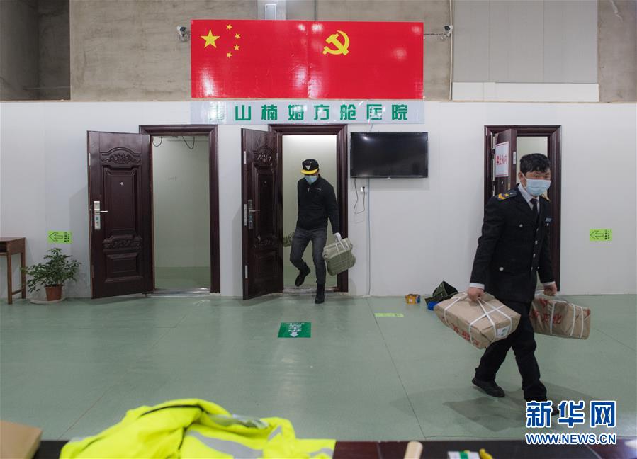 2月25日,在青山楠姆方艙醫(yī)院,工作人員在現(xiàn)場忙碌。  新華社記者 肖藝九 攝