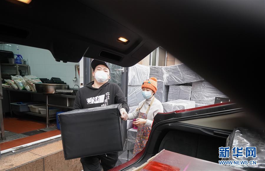 2月26日,劉女士(右)和伙計(jì)把裝滿盒飯的保溫箱搬上車(chē)。新華社記者程敏攝