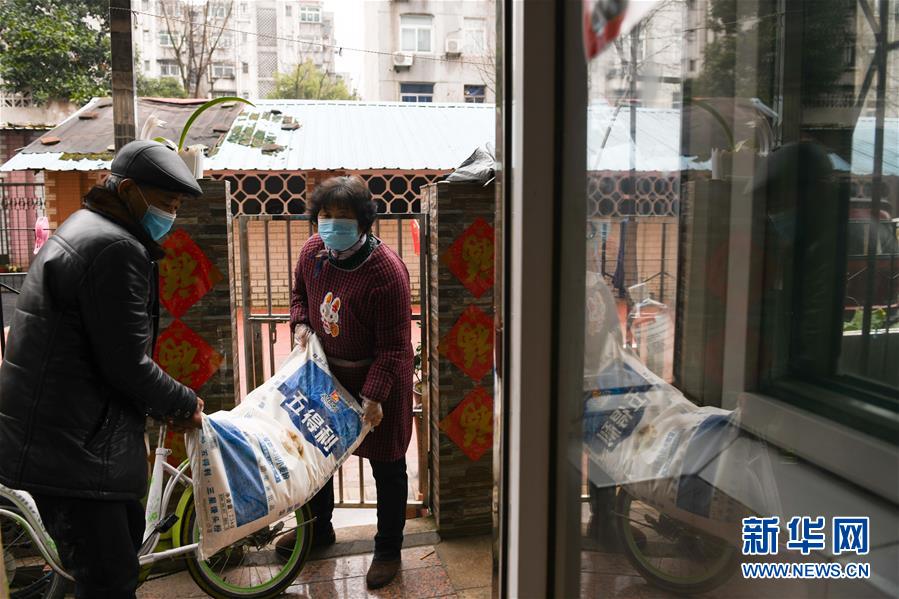 2月29日,張?zhí)m英(右)和老伴徐金保買來做包子所需的面粉。新華社記者張端攝