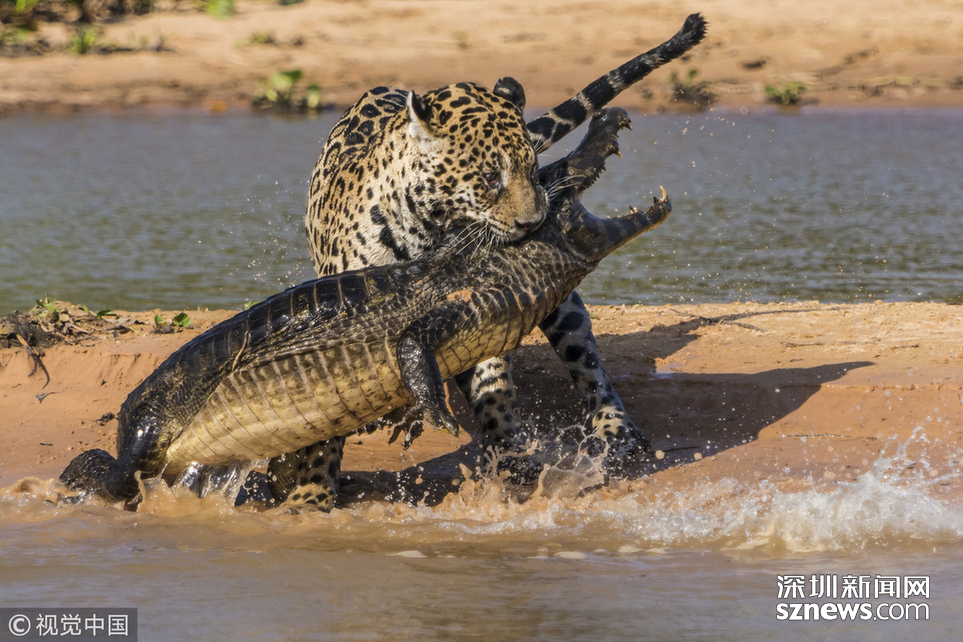 當?shù)貢r間2013年8月25日,巴西潘特納爾,一頭雄性美洲豹攻擊了一條巴拉圭凱門鱷并與之纏斗。這只美洲豹預先躲在水中匍匐前進,然后突然出現(xiàn)把這只鱷魚震住,隨后用牙刺進鱷魚的堅硬的外殼中,將其拖入?yún)擦帧?/p>