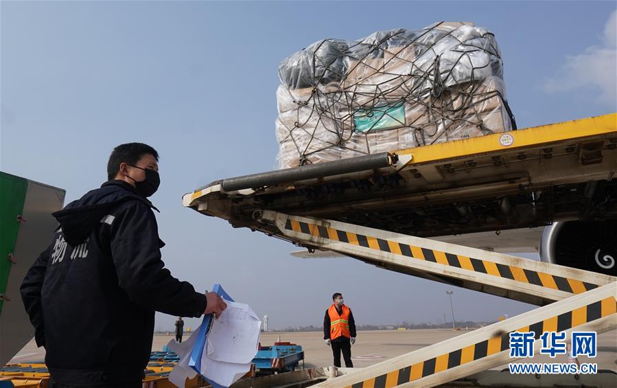 1月28日,滿載醫(yī)療防疫物資的貨運飛機(jī)在武漢天河機(jī)場卸貨。新華社記者 程敏 攝
