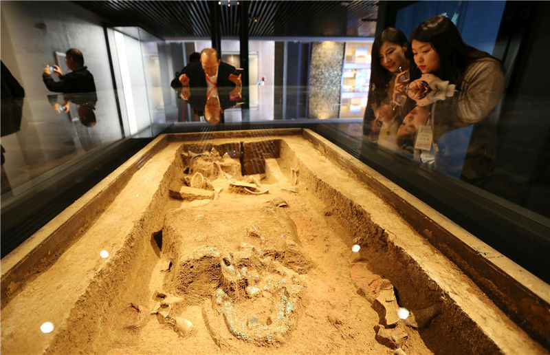 2019年10月19日,河南洛陽,二里頭夏都遺址博物館。觀眾在觀看當(dāng)年的考古現(xiàn)場(chǎng)。