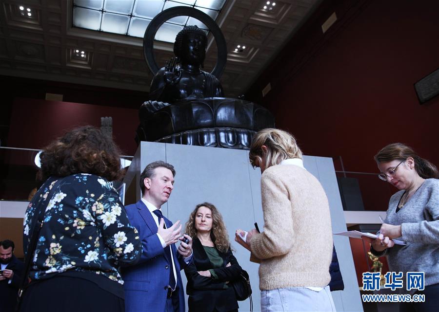 3月2日,在法國巴黎,賽努奇亞洲藝術博物館館長埃里克·勒菲弗(左二)接受媒體采訪。法國巴黎賽努奇亞洲藝術博物館經過數(shù)月修繕后2日迎客,以更加豐富的展品、全新場景布置和多媒體呈現(xiàn)方式向觀眾展示中國文化和亞洲文化魅力。新華社記者高靜攝