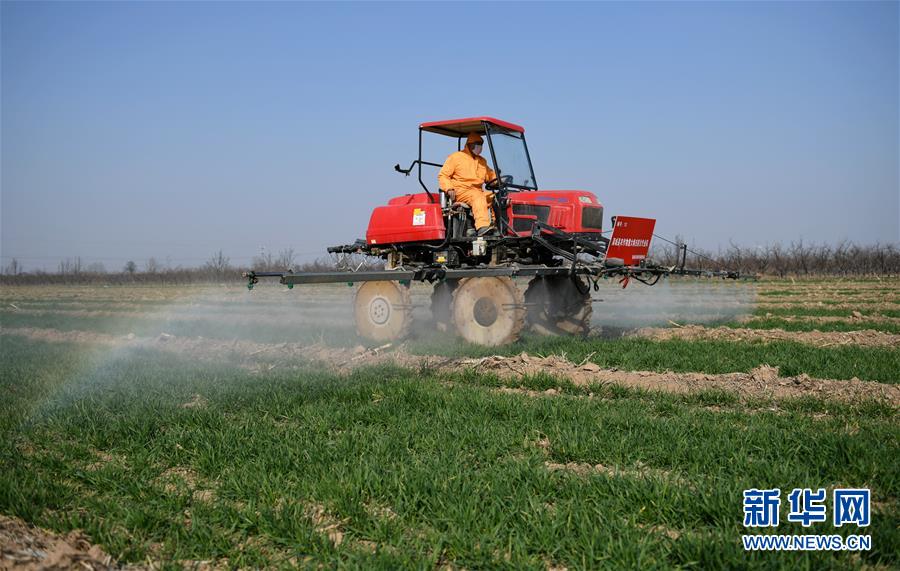 3月4日,建建農機合作社社員在蒲城縣椿林鎮(zhèn)平峨村駕駛自走式高桿噴霧機為小麥噴灑除草殺菌劑。近日,為確保疫情期間不誤農時,陜西省蒲城縣植保植檢站組織縣內7家農作物病蟲害專業(yè)化防治單位,在小麥返青起身期,對麥田進行除草及病蟲害的防控工作。新華社記者李一博攝