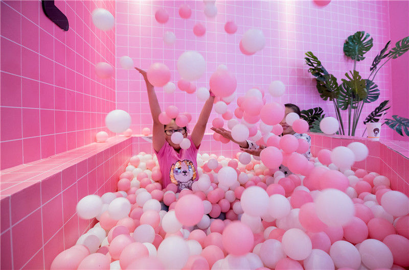 2018年9月20日,呼和浩特玉泉區(qū),市民在夢幻love粉色小屋內留影游玩。丁根厚/視覺中國