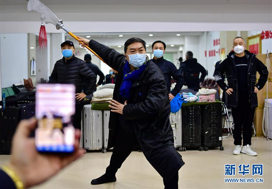 太原市晉劇藝術(shù)研究院的工作人員在為戲迷直播武凌云(左二)排練晉劇(3月9日攝)。 新華社記者 曹陽 攝