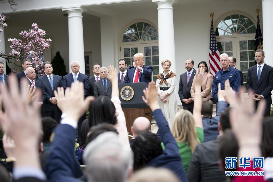 3月13日,在美國華盛頓白宮,美國總統(tǒng)特朗普(中)出席記者會。特朗普當天下午在白宮發(fā)表講話時正式宣布“國家緊急狀態(tài)”。他說,此舉旨在讓美國聯(lián)邦政府全力投入到抗擊新冠肺炎疫情的努力中。這項舉措將釋放500億美元資金,幫助各州和地方政府應(yīng)對疫情。新華社記者劉杰攝